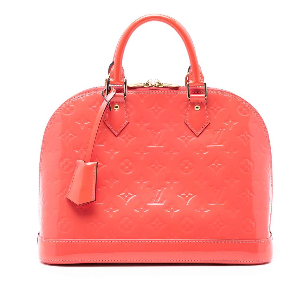 The Alma features a monogram vernis leather body, rolled leather handles, a top zip closure, and interior slip pockets.