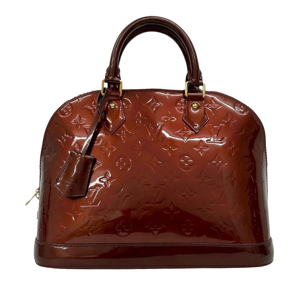 The Alma PM features a monogram vernis leather body, a clochette, rolled leather handles, a top zip closure, and interior slip pockets.