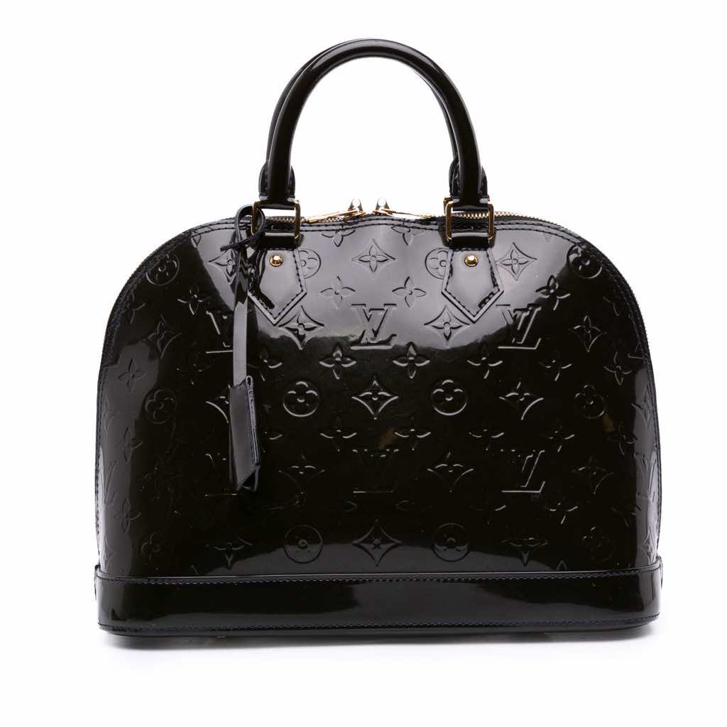 The Alma PM features a monogram vernis leather body, rolled leather handles, a top zip closure, and interior slip pockets.