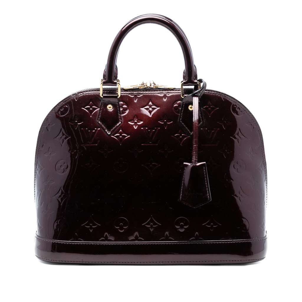 The Alma PM features a monogram vernis leather body, rolled leather handles, a top zip closure, and interior slip pockets.