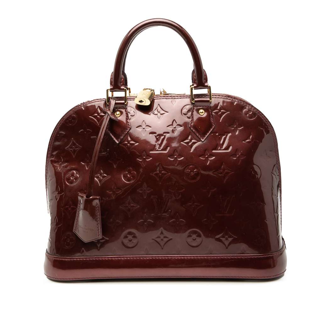 The Alma PM features a monogram vernis leather body, rolled leather handles, a top zip closure, and interior slip pockets.
