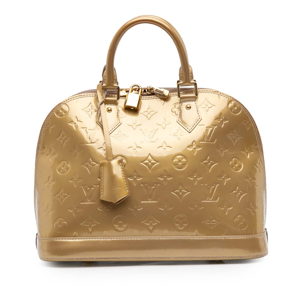 The Alma features a monogram vernis leather body, rolled patent leather handles, a top zip closure, and interior slip pockets.