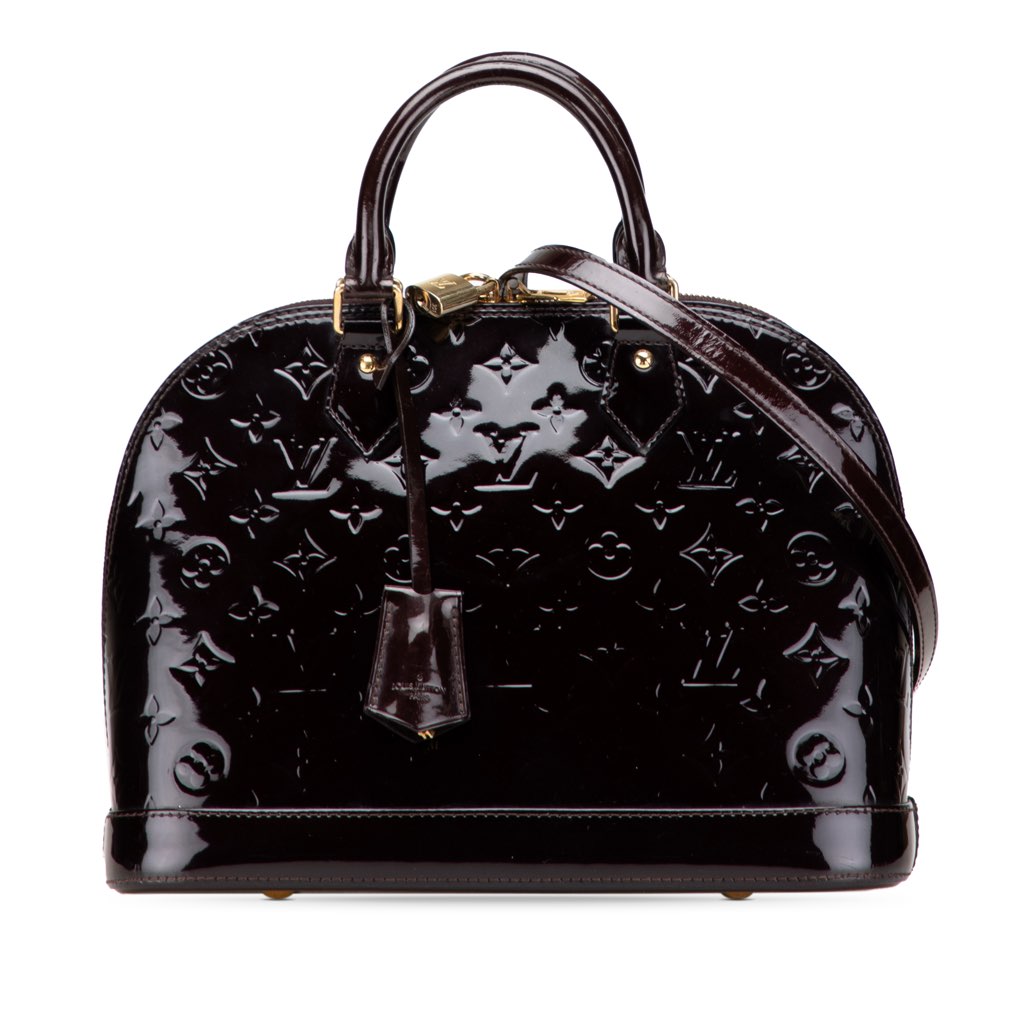 The Alma PM features a monogram vernis leather body, rolled leather handles, a top zip closure, and interior slip pockets.
