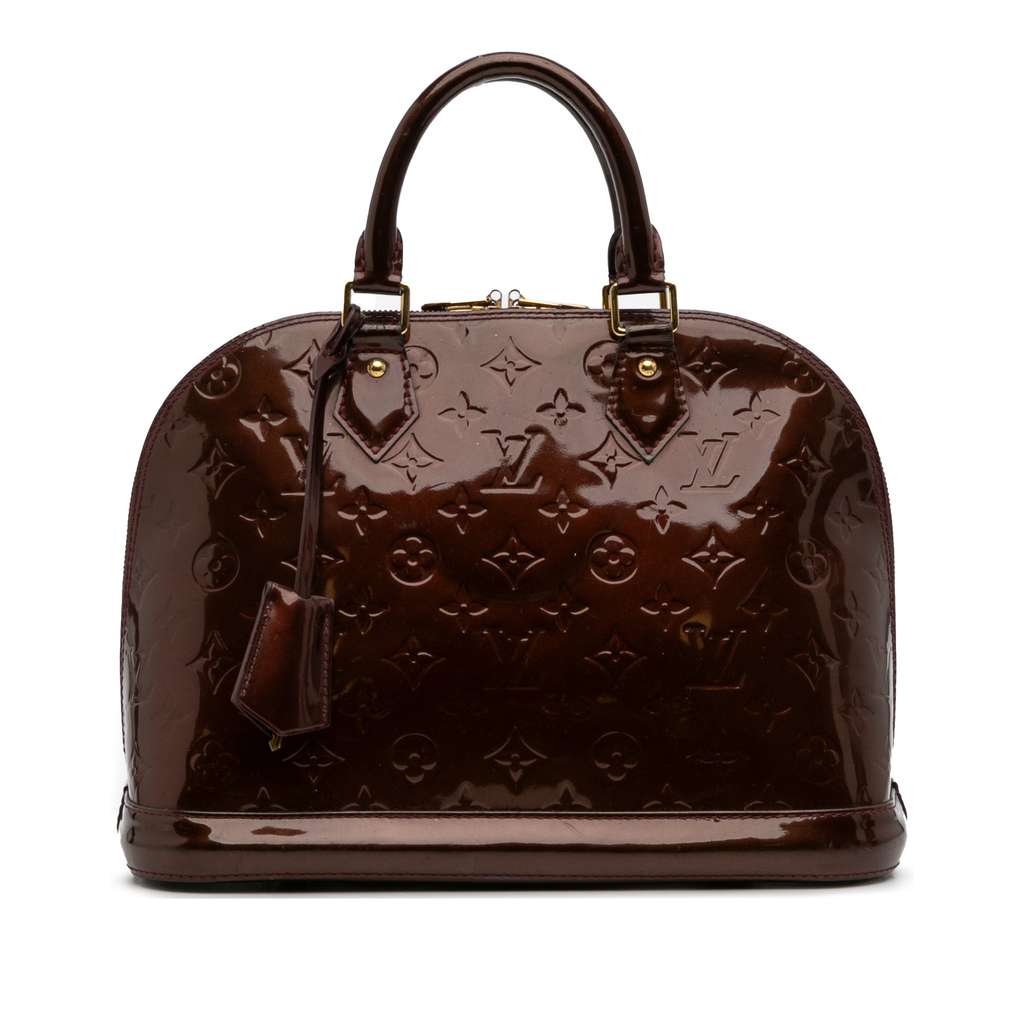 The Alma PM features a monogram vernis leather body, rolled leather handles, a top zip closure, and interior slip pockets.