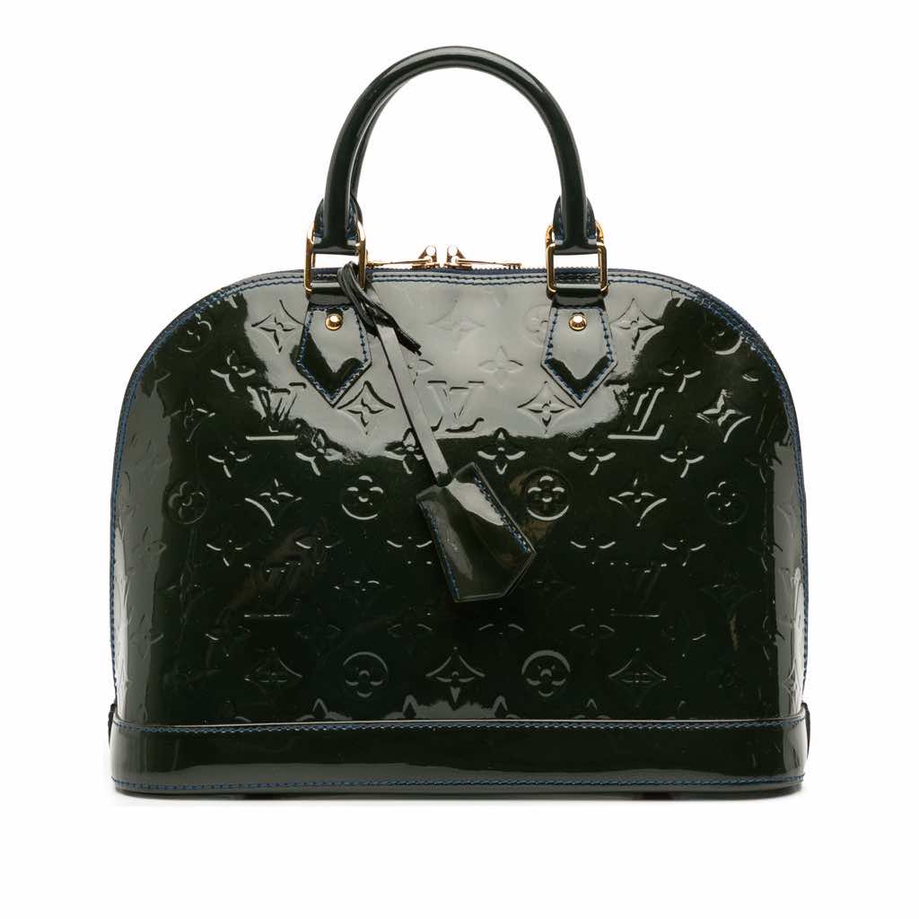 The Alma PM features a monogram vernis leather body, rolled leather handles, a top zip closure, and interior slip pocket.