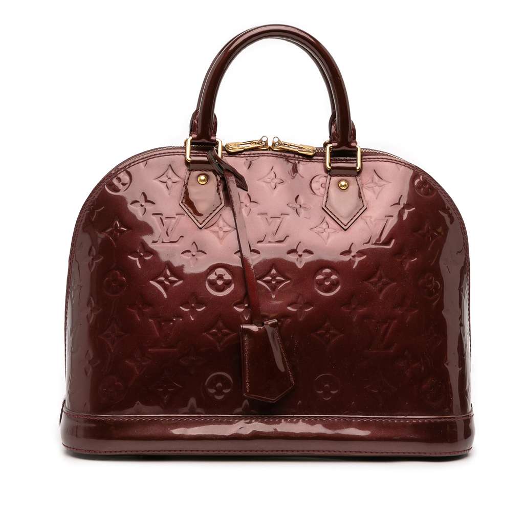 The Alma PM features a monogram vernis leather body, a clochette, rolled leather top handles, a top zip closure, and interior slip pockets.