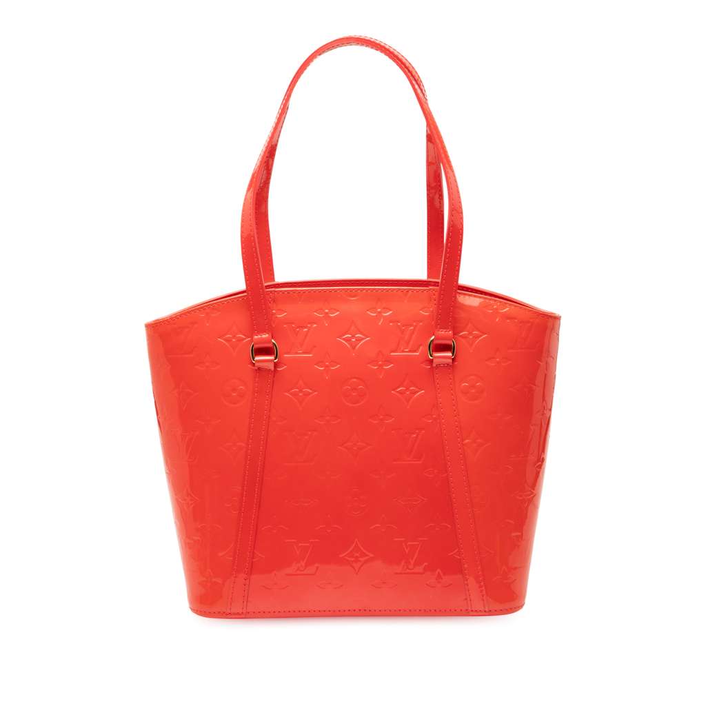 The Avalon MM features a monogram vernis leather body, flat leather straps, an open top with a lobster clasp closure, and interior zip and slip pockets.