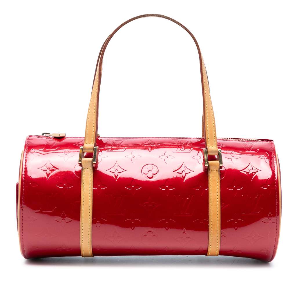 The Bedford features Vernis leather, vachetta flat straps and trim, and a top zip closure.