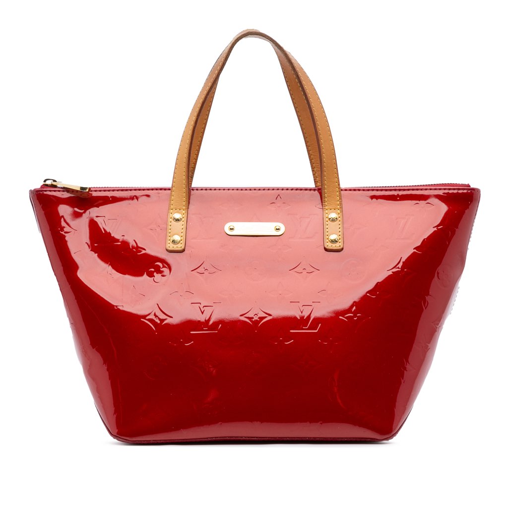 The Monogram Vernis Bellevue PM features a vernis leather body, flat vachetta leather handles, a top zip closure, and interior slip pockets