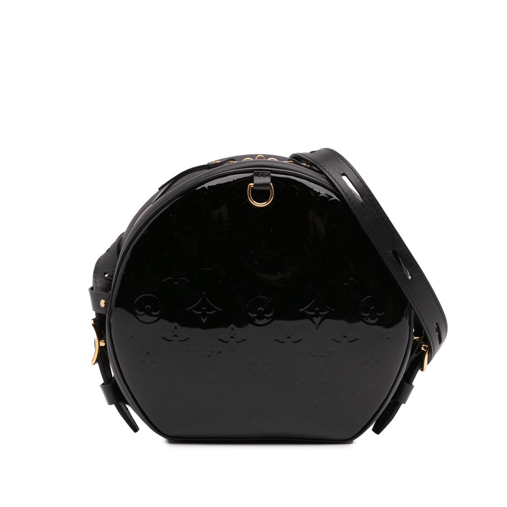 The Boite Chapeau Souple MM features a vernis leather body, an adjustable and detachable flat leather strap, a top zip closure, an exterior back slip pocket, and an interior slip pocket.