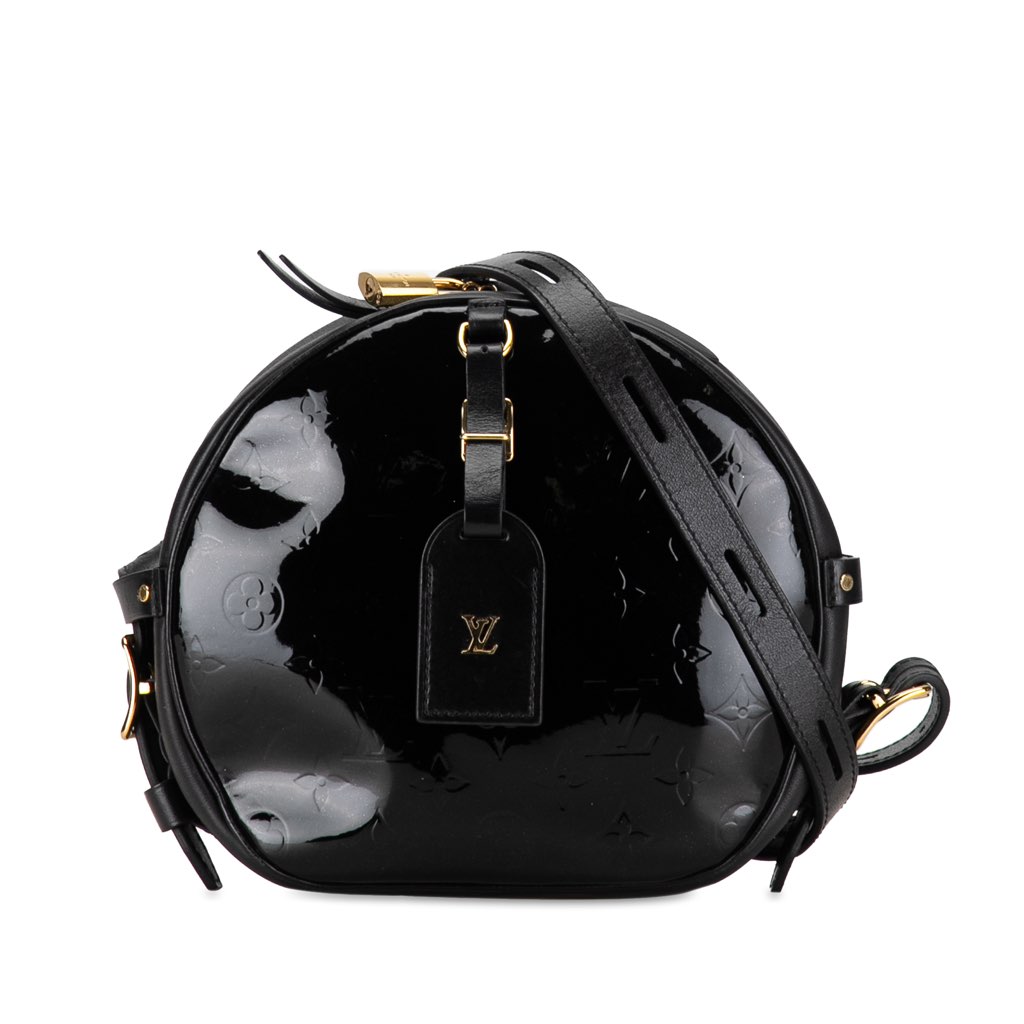 The Boite Chapeau Souple MM features a vernis leather body, an adjustable and detachable flat leather strap, a top zip closure, an exterior back slip pocket, and an interior slip pocket.