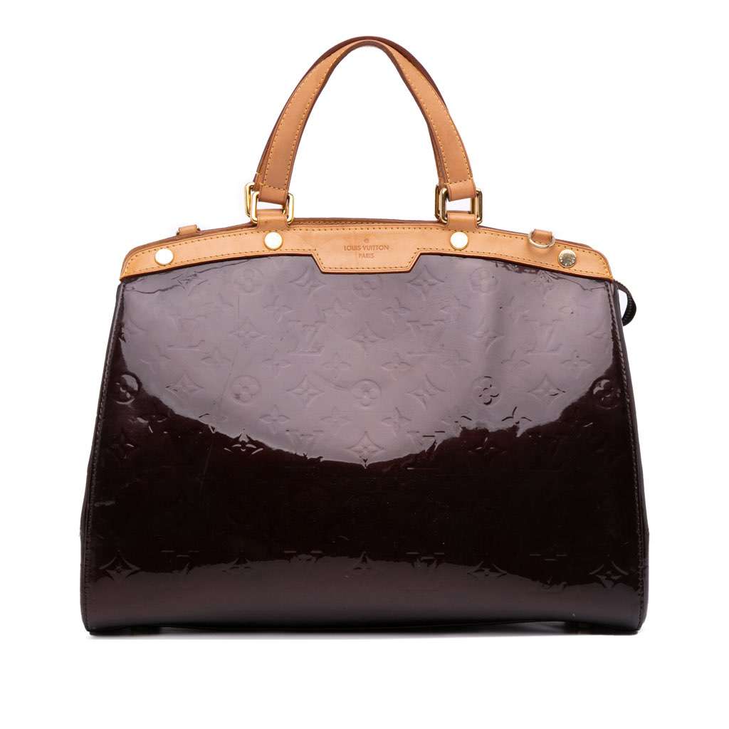 The Brea GM features a monogram vernis leather body with vachetta leather trim, flat vachetta leather handles, a top zip closure, and interior zip and slip pockets.
