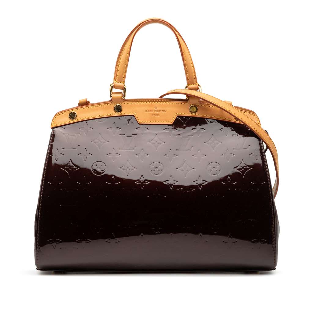 The Brea MM features a monogram vernis leather body with vachetta leather trim, flat vachetta leather handles, a detachable flat vachetta leather strap, a top zip closure, and interior zip and slip pockets.