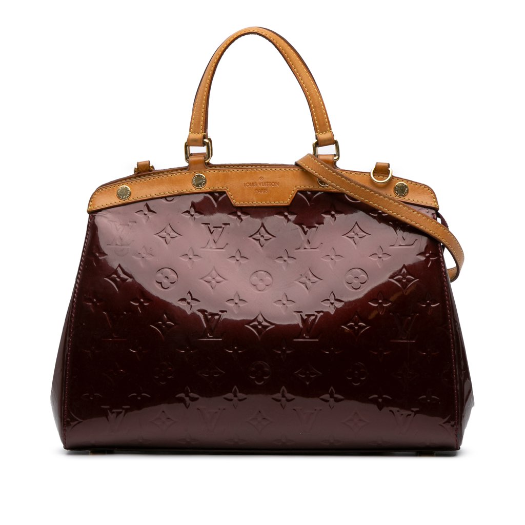 The Brea MM features a monogram vernis leather body with vachetta leather trim, flat vachetta leather handles, a detachable vachetta leather strap, a top zip closure, and interior zip and slip pockets.
