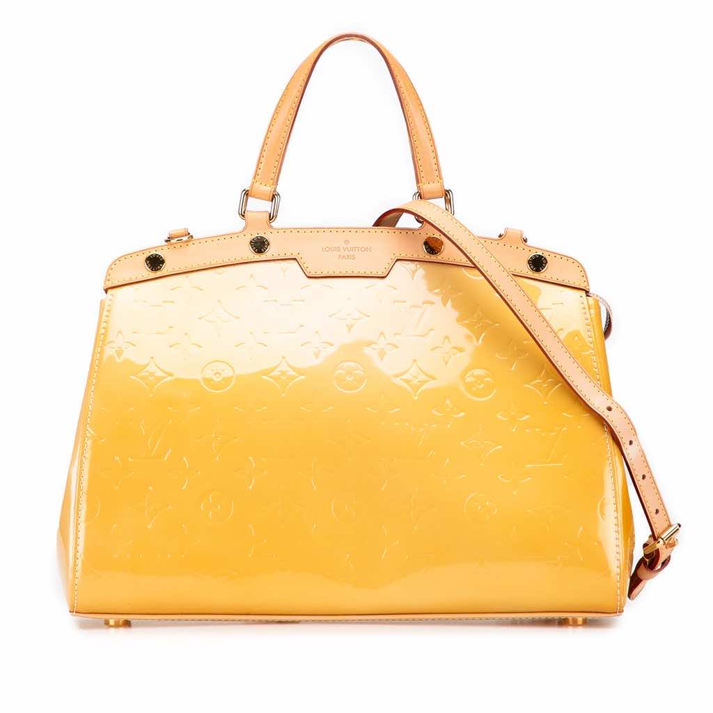 The Brea MM features a monogram vernis leather body with vachetta leather trim, flat vachetta leather handles, a detachable flat vachetta leather strap, a top zip closure, and interior zip and slip pockets.