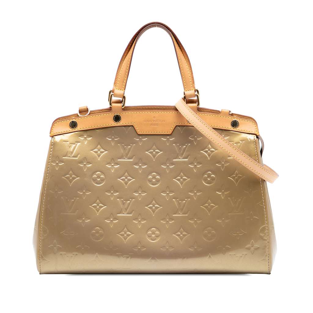 The Brea MM features a monogram vernis leather body, flat vachetta leather handles, a detachable vachetta leather strap, a top zip closure, and interior zip and slip pockets.