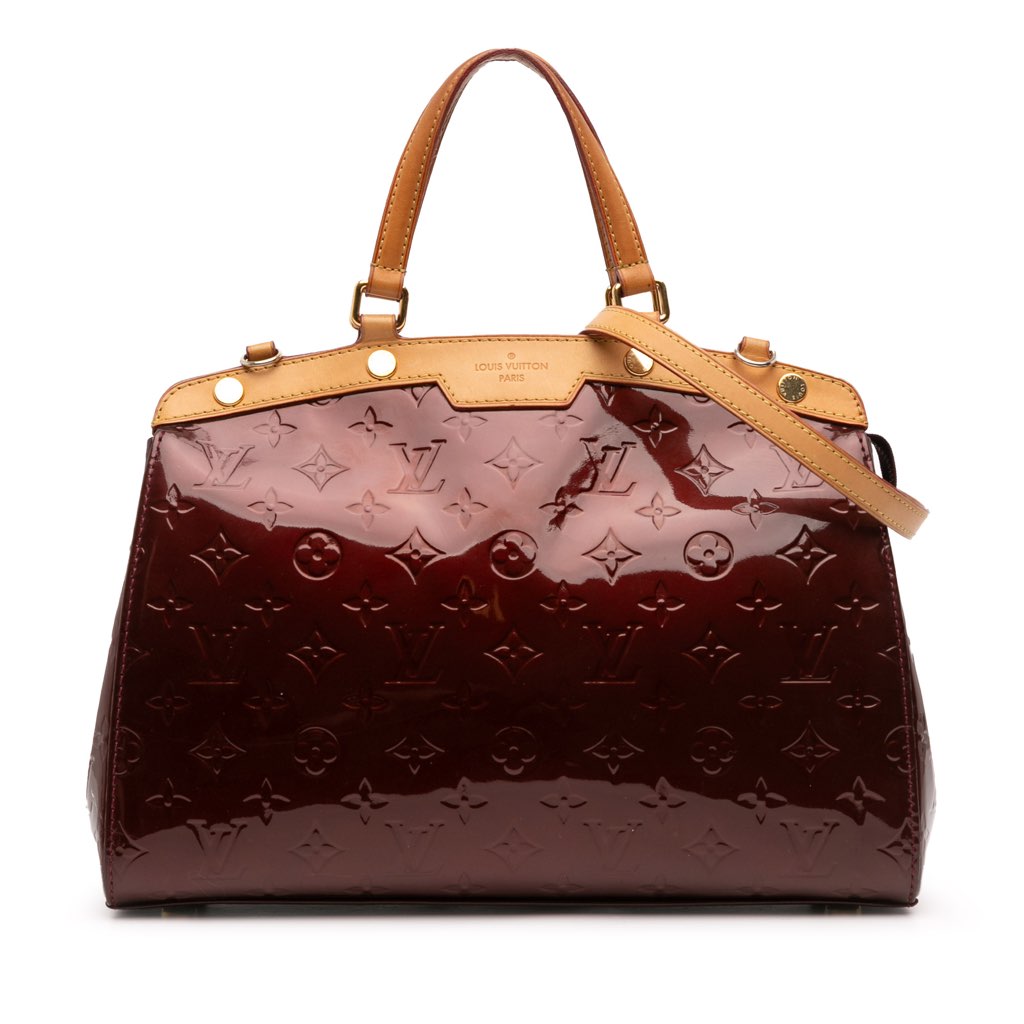 The Brea MM features a monogram vernis leather body, flat vachetta leather handles, a detachable leather strap, a top zip closure, and interior zip and slip pockets. The top was repainted.