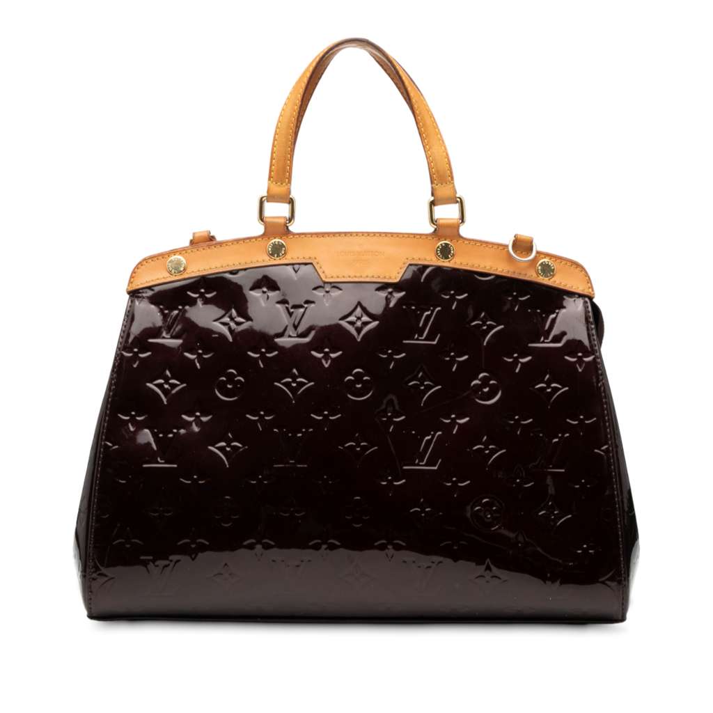 The Brea MM features a monogram vernis leather body with vachetta leather trim, flat vachetta leather handles, a top zip closure, and interior zip and slip pockets.