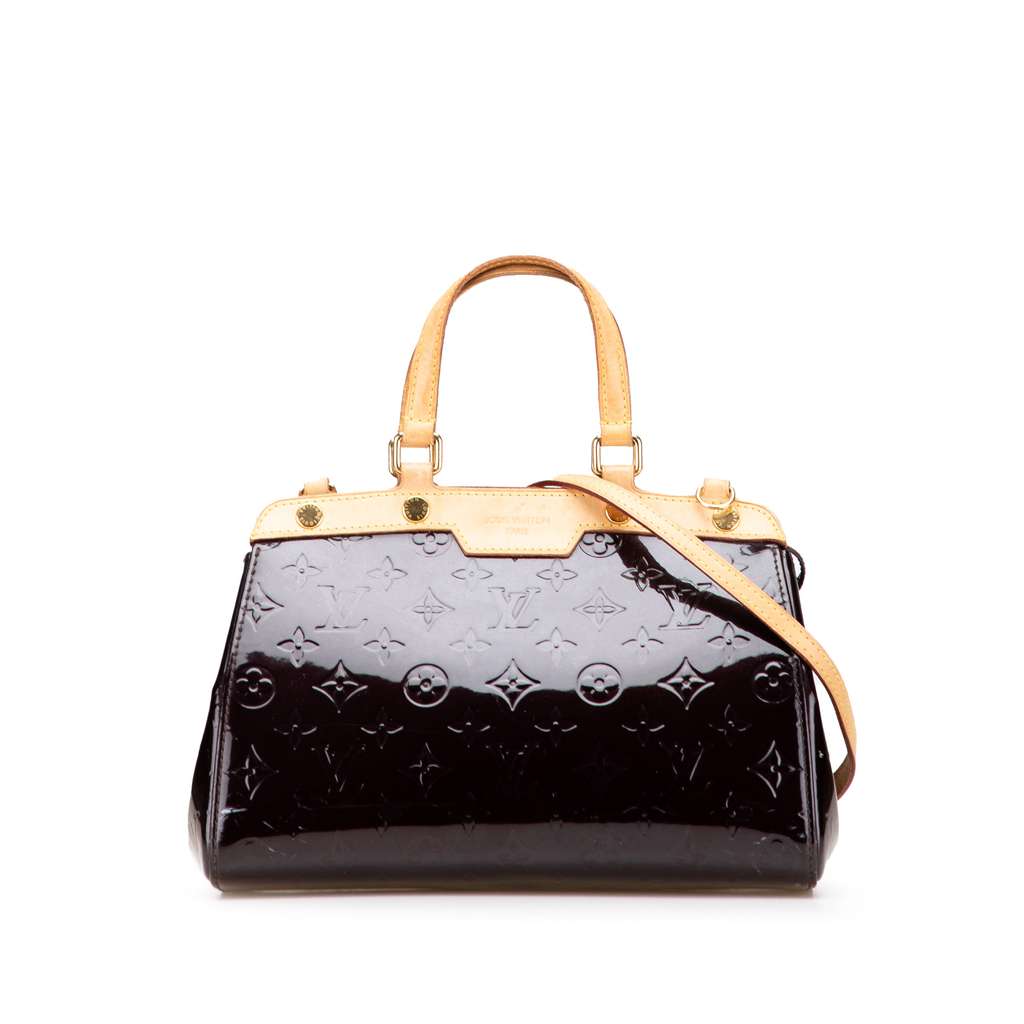 The Brea features a vernis leather body with vachetta leather trim, flat vachetta leather handles, a detachable and adjustable flat vachetta leather strap, a top zip closure, and an interior slip pocket.