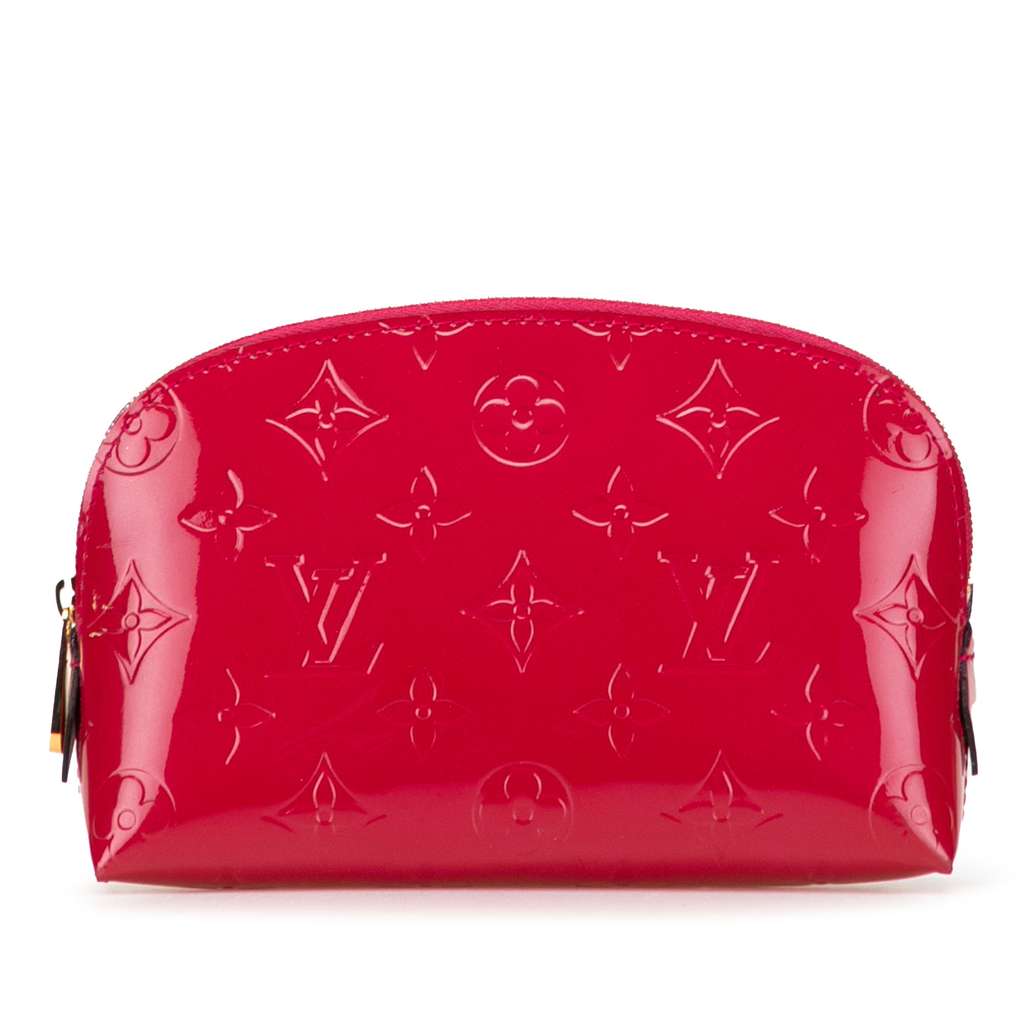 The Vernis Cosmetic Pouch features a monogram vernis leather body, a top zip closure, and an interior slip pocket.