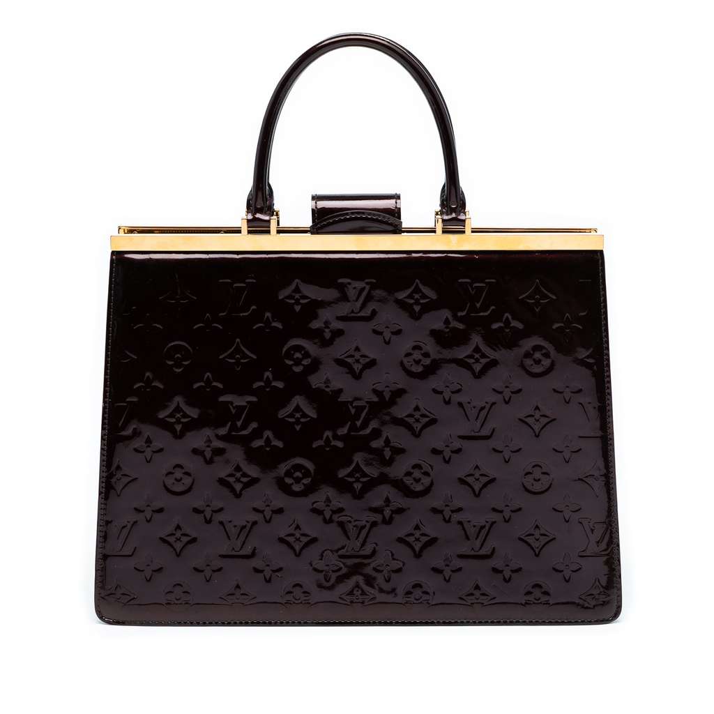 The Deesse GM features a monogram vernis leather body, rolled leather handles, a metal frame with a snap closure, an interior zip compartment, and interior slip pockets.
