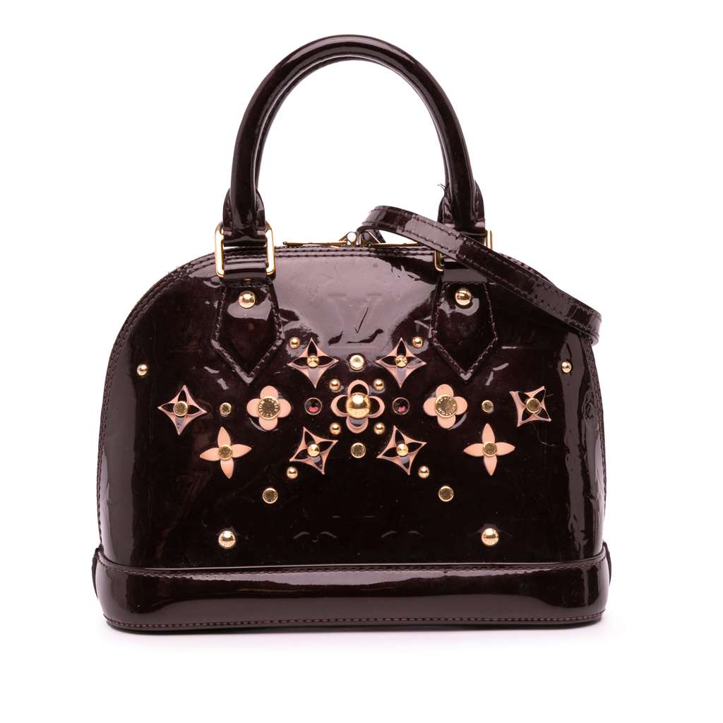 The Alma features a vernis leather body with front flower appliques and stud details, rolled leather handles, an adjustable flat leather strap, a top zip closure, and an interior slip pocket.