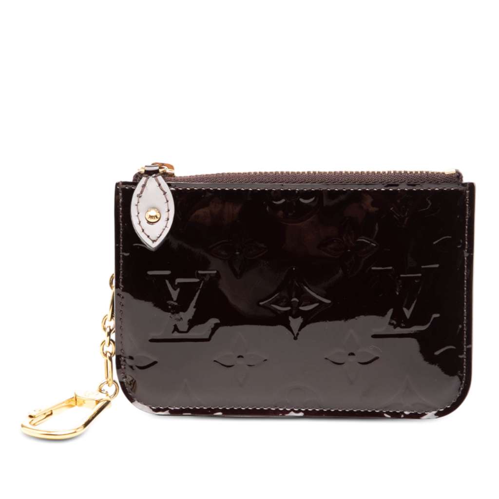 This coin pouch features a monogram vernis leather body, a top zip closure, an exterior slip pocket, and a chain with hook attachment.