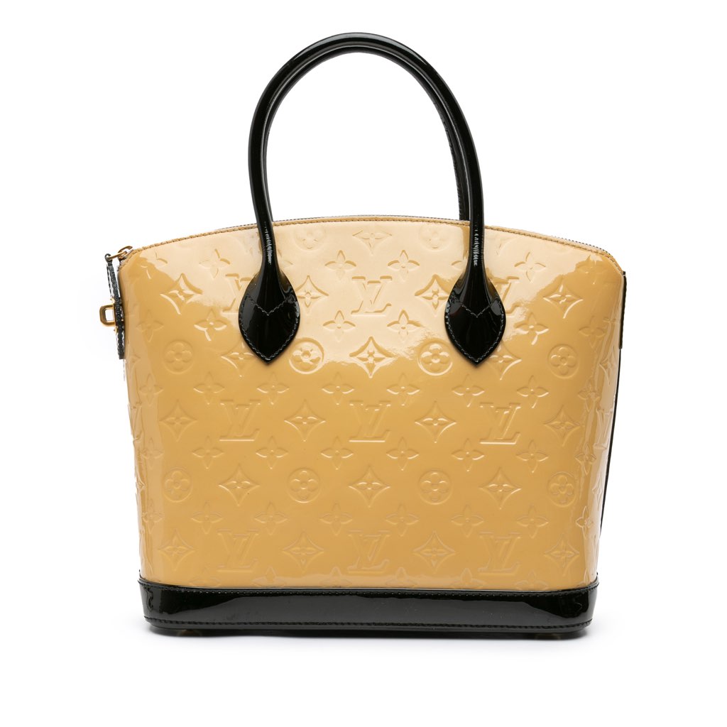 The Lockit PM features a monogram vernis leather body, rolled leather handles, a top zip closure, and interior zip and slip pockets.