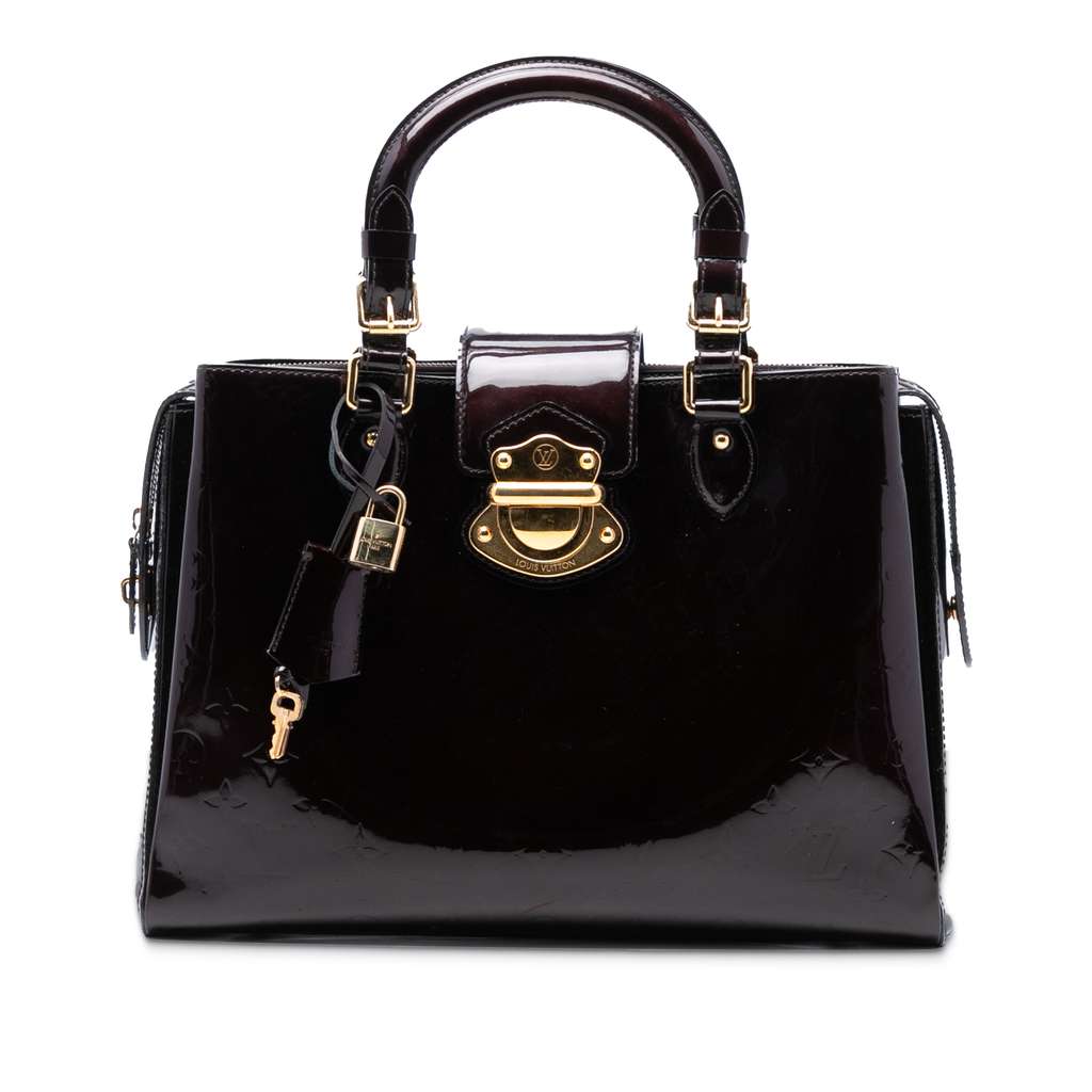 The Vernis Melrose Avenue features a vernis leather body, rolled leather handles, front flap strap with push lock closure, a top zip closure, and interior open pockets.