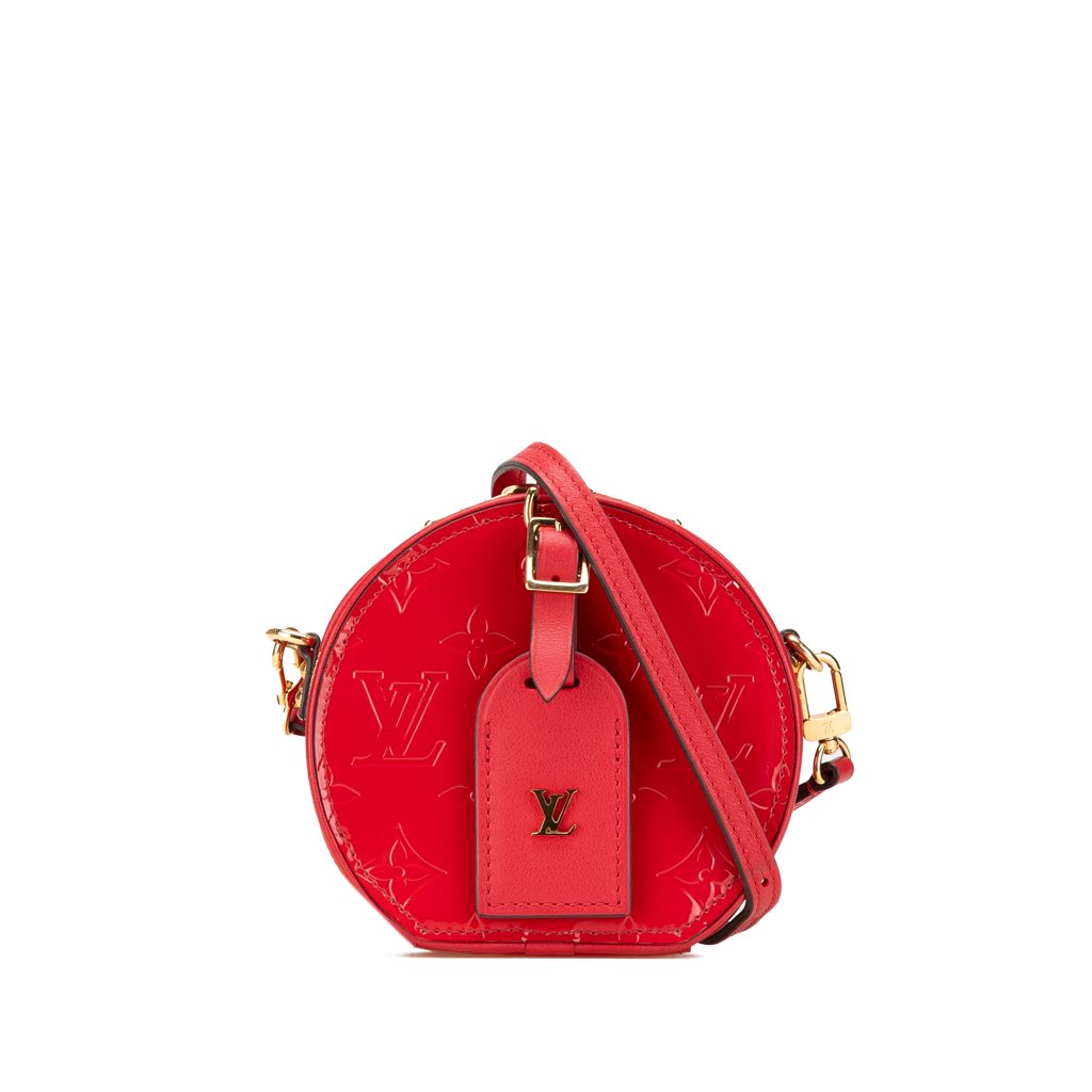 The Boite Chapeau Souple features a vernis leather body, an adjustable flat leather strap, a top zip closure, and an interior slip pocket.