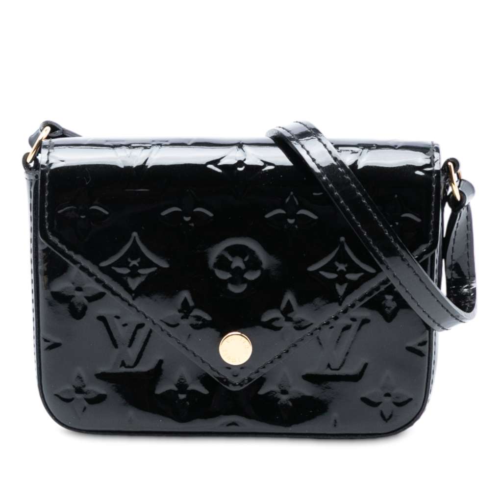The Mini Sac Lucie features a monogram vernis leather body, a flat leather strap, a top flap with snap button closure, and interion slip pockets.