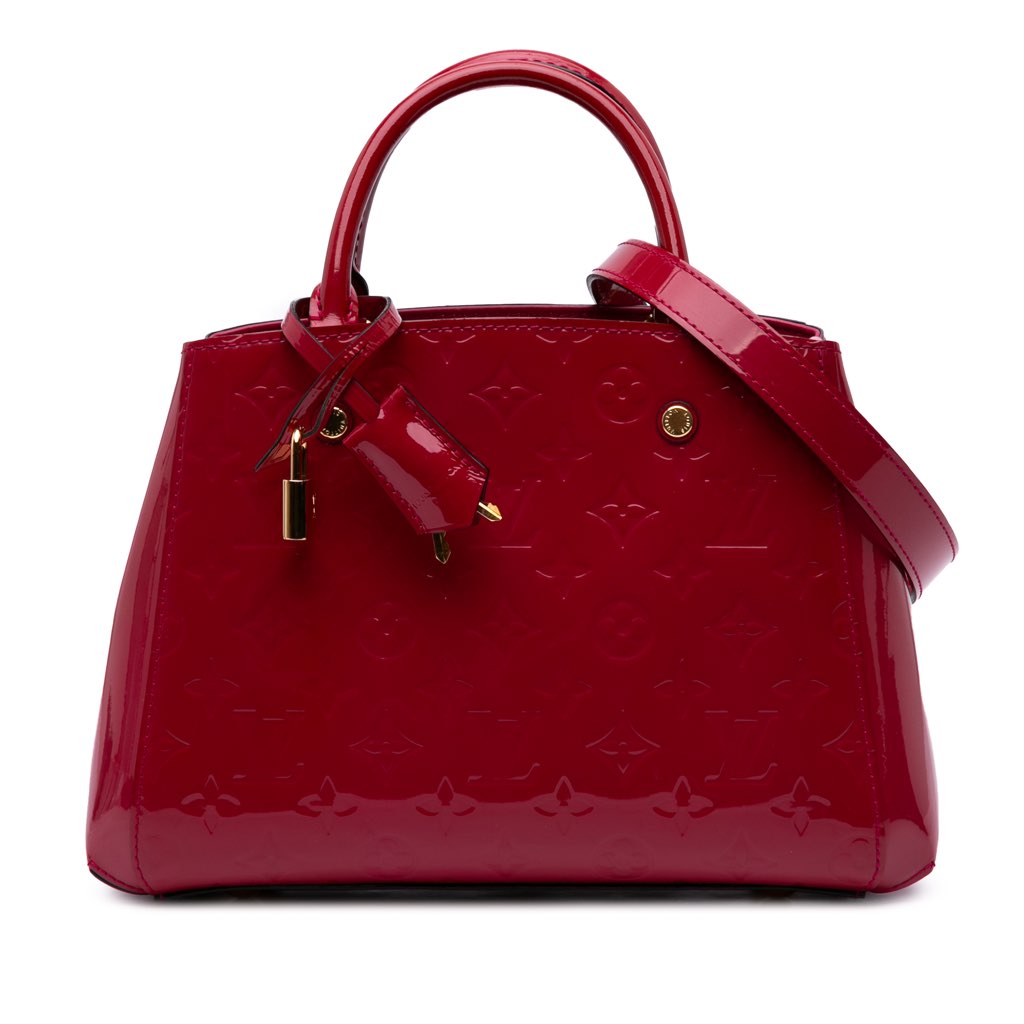 The Montaigne BB features a monogram vernis leather body, rolled leather handles, a detachable leather strap, an open top with clasp closure, and interior slip and zip pockets.