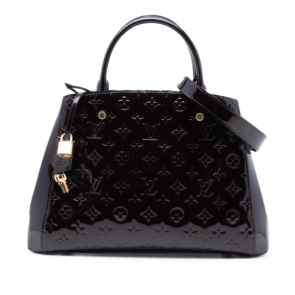 The Montaigne MM features a monogram vernis leather body, rolled leather handles, a detachable flat leather strap, an open top with a clasp closure, a zip compartment, and interior slip and zip pockets.