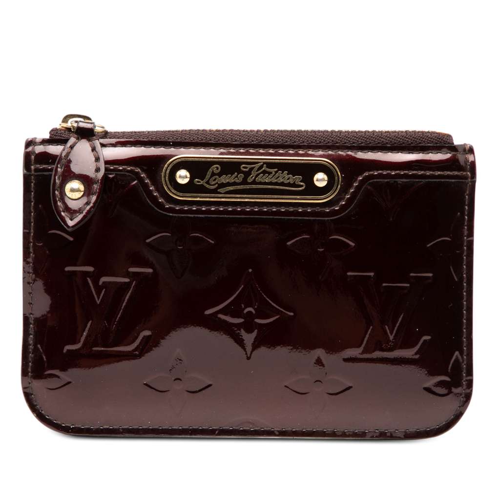 This coin ppouch featues a monogram vernis leather body, a top zip closure, and an exterior slip pocket.