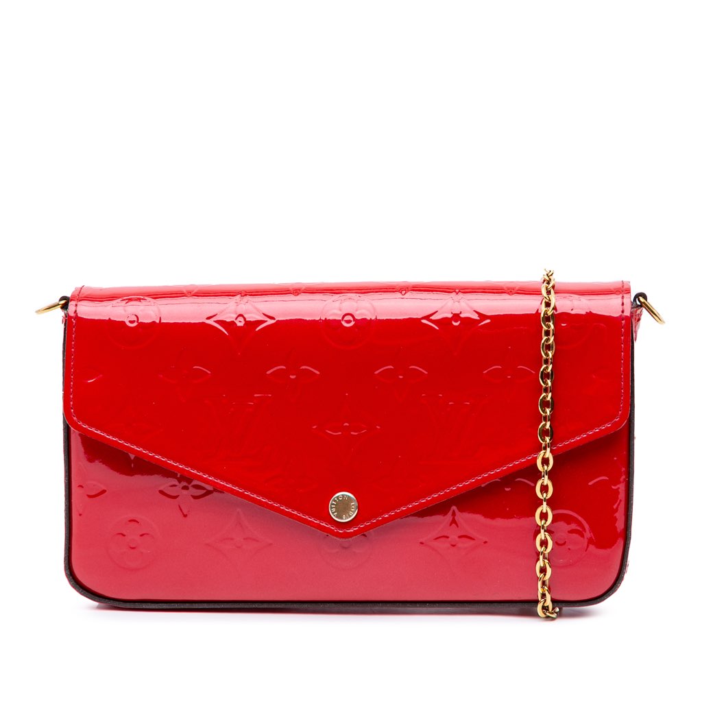 The Pochette Felicie features a monogram vernis leather body, a detachable chain link shoulder strap, a flap with snap button closure, and an interior slip pocket.