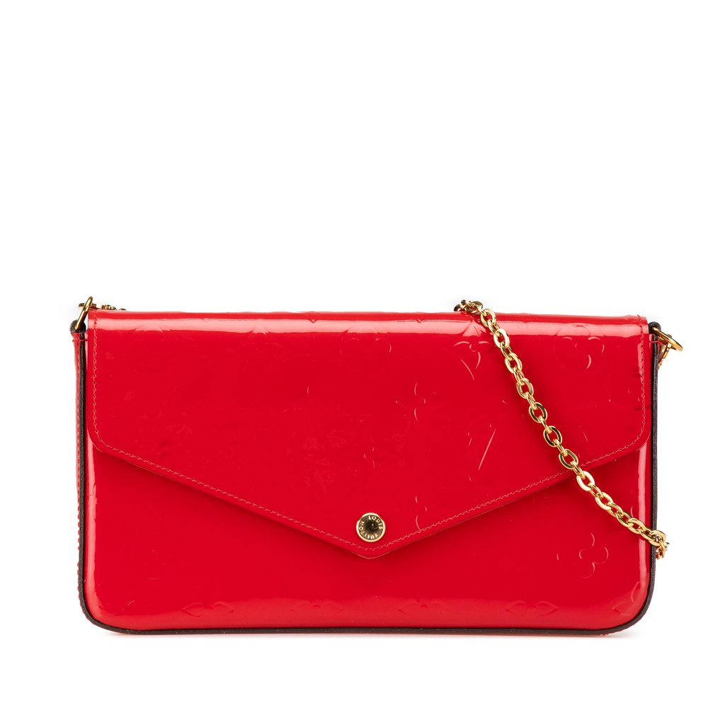 The Pochette Felicie features a monogram vernis body, a detachable chain shoulder strap, a flap with snap button closure, and an interior slip pocket.