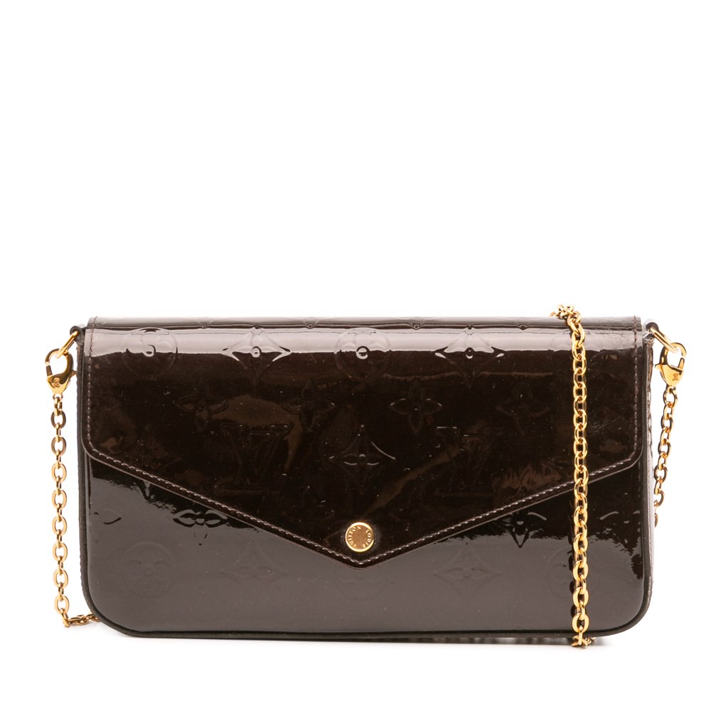 The Pochette Felicie features a monogram vernis leather body, a detachable gold-tone chain strap, a top flap with snap button closure, an interior slip pocket, and pouch inclusions.