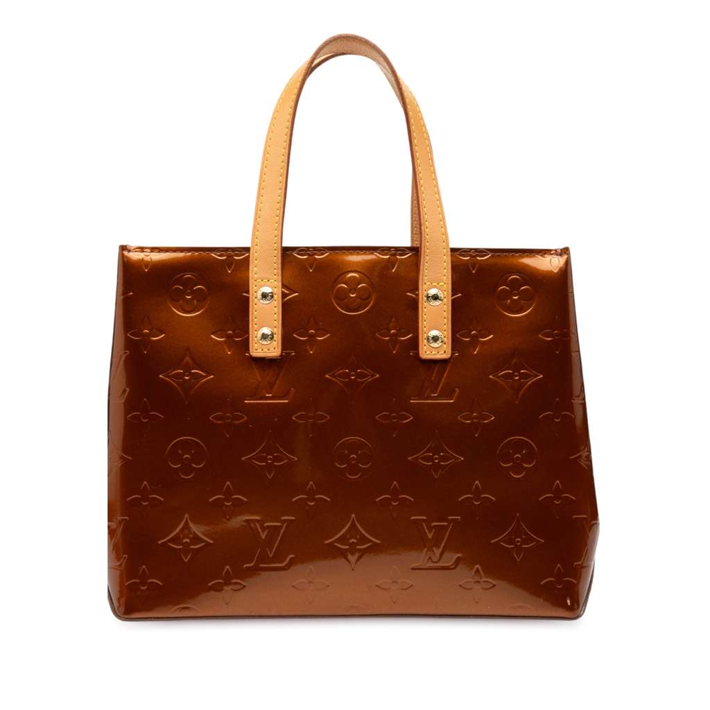 The Reade PM features a vernis leather body, flat vachetta leather handles, an open top, and an interior zip pocket. Handles have been re-glossed.