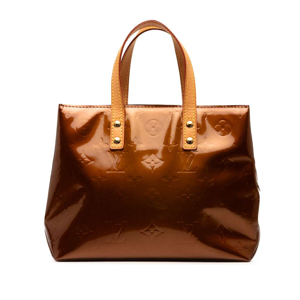 The Reade PM features a vernis leather body, flat vachetta leather handles, an open top, and an interior zip pocket.