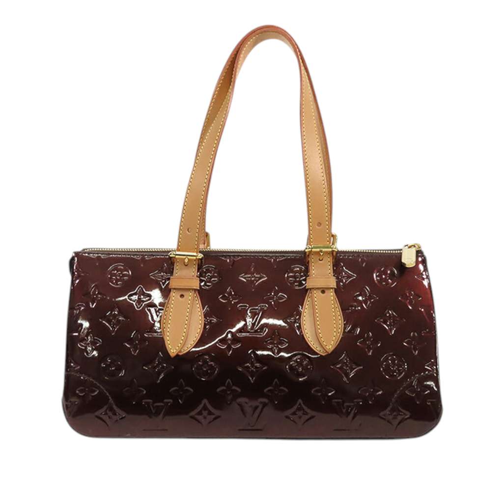 The Rosewood Avenue features a monogram vernis leather body, flat vachetta leather shoulder straps, a top zip closure, an exterior slip pocket, and an interior slip pocket.