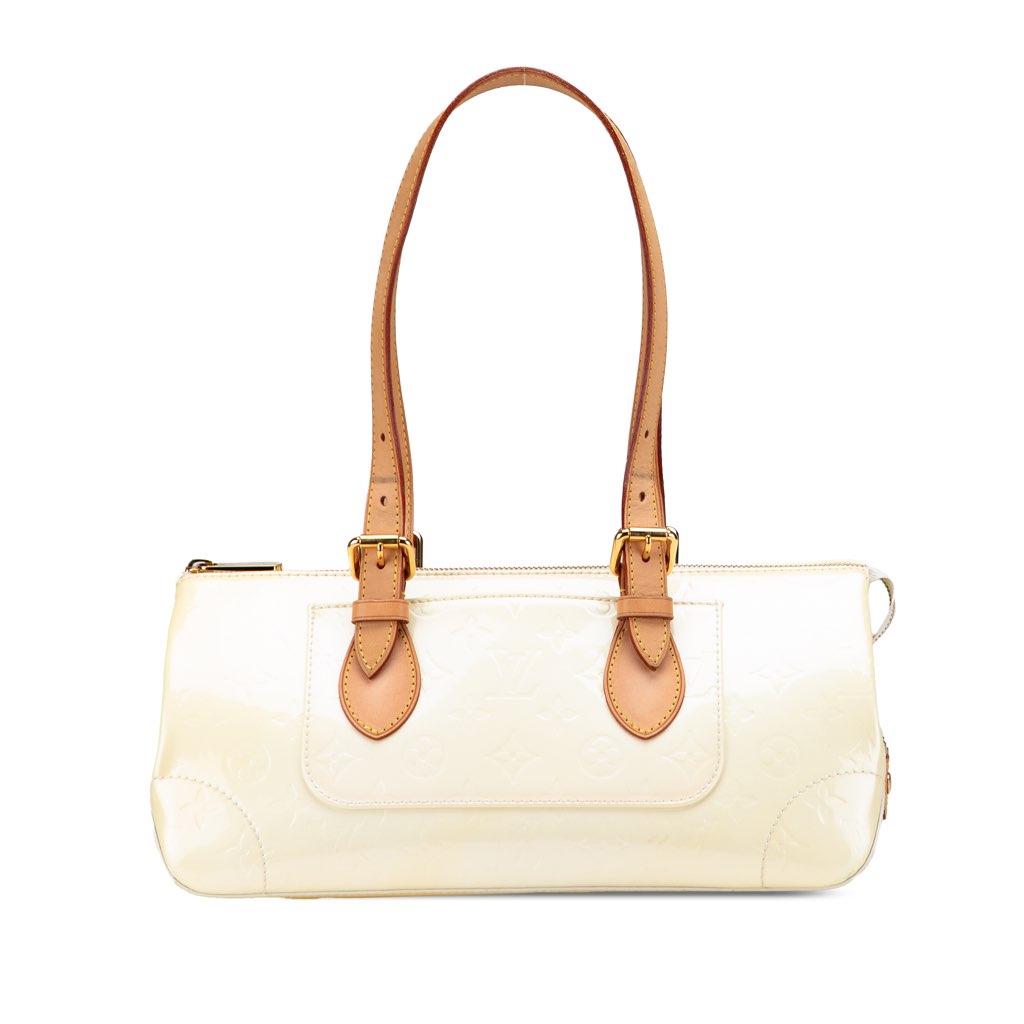 The Rosewood Avenue features a vernis leather body, flat vachetta leather shoulder straps, a top zip closure, an exterior back slip pocket, and an interior slip pocket.