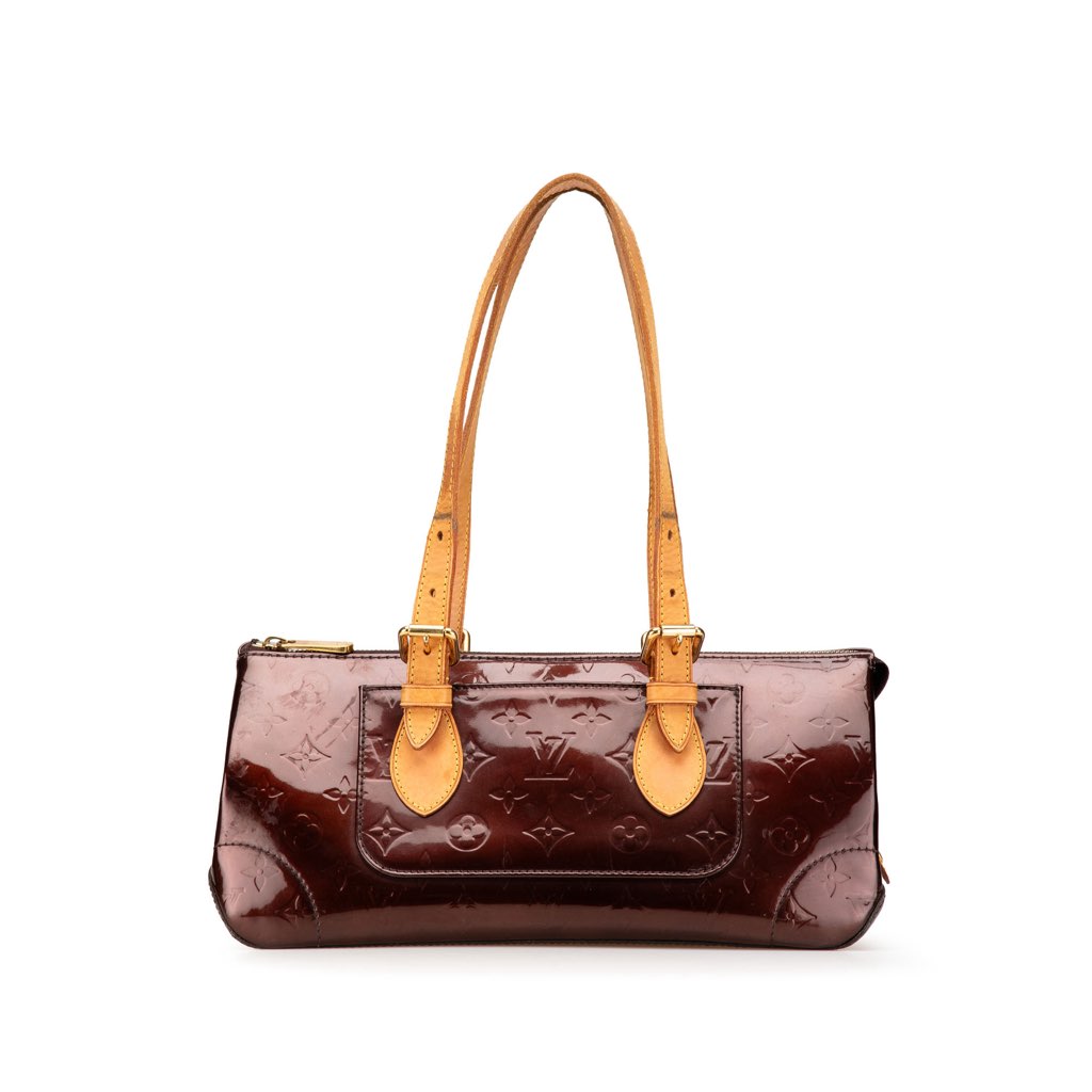 The Rosewood Avenue features a monogram vernis leather body, flat vachetta leather shoulder straps, a top zip closure, an exterior slip pocket, and an interior slip pocket.