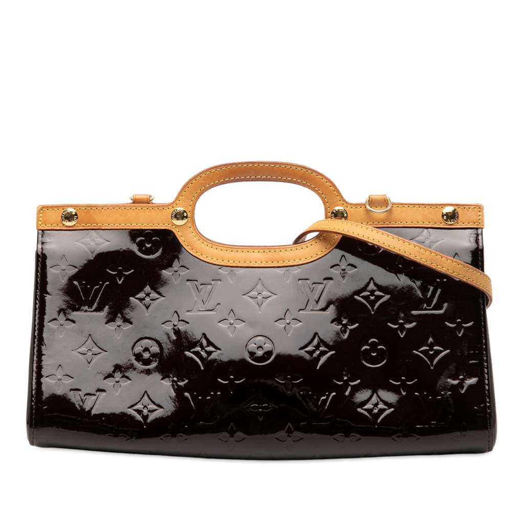 The Roxbury Drive features a monogram vernis leather body, cutout vachetta leather top handles, a detachable vachetta leather strap, an open top with dual snap fastener closure, and an interior slip pocket.