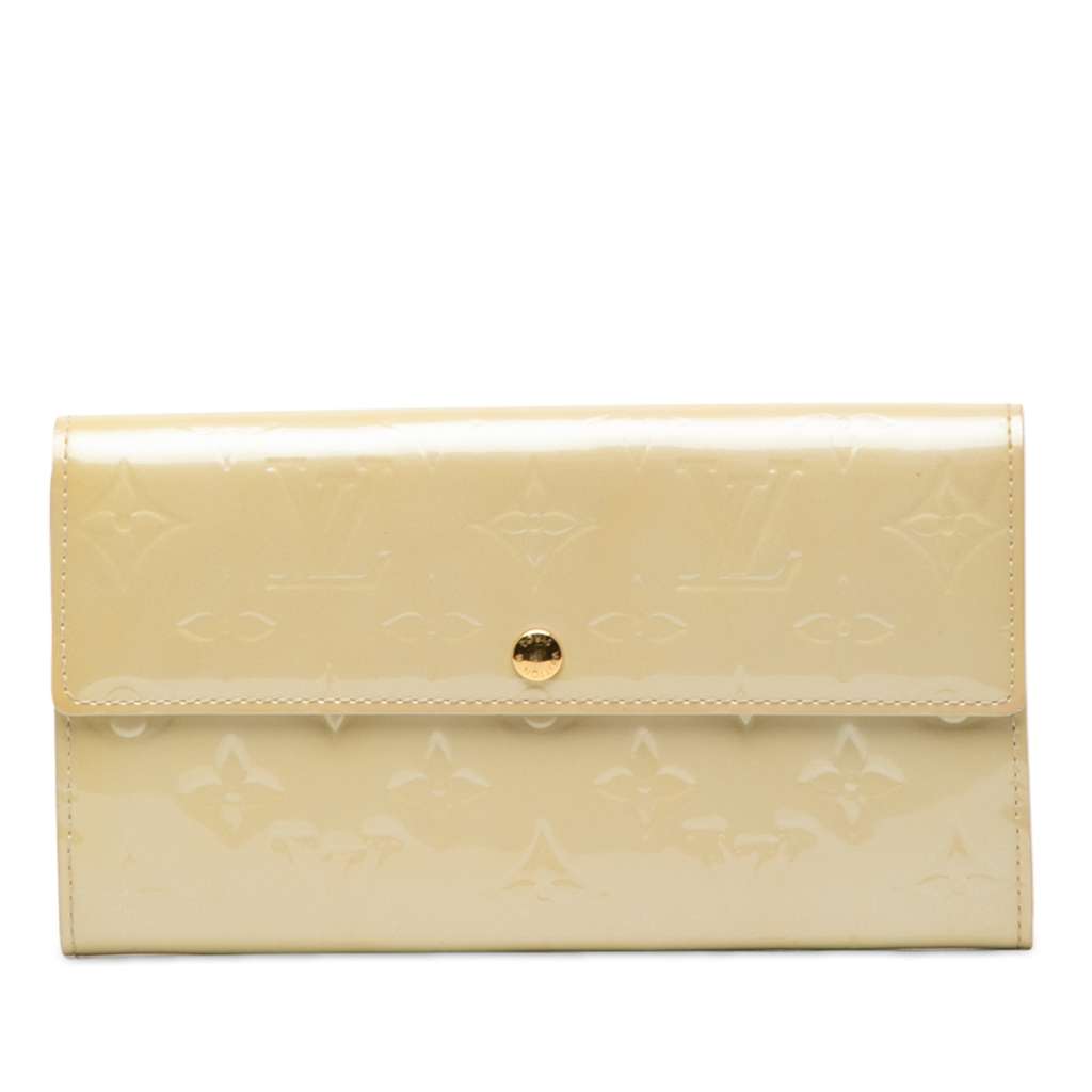 This wallet features a monogram vernis leather body, a flap with snap closure, and interior zip and slip compartments.