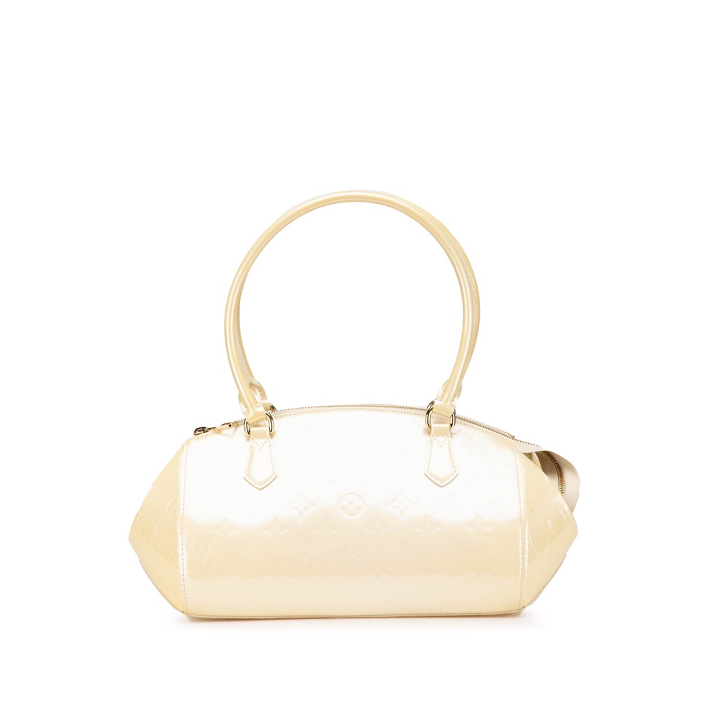The Sherwood PM features a monogram vernis leather body, rolled leather handles, a top zip closure, and an interior slip pocket.