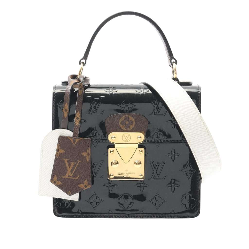 The Spring Street features a monogram vernis leather body with epi leather side panels, a flat top handle, a detachable flat epi leather strap, a front flap with an S-lock closure, and an interior slip pocket.