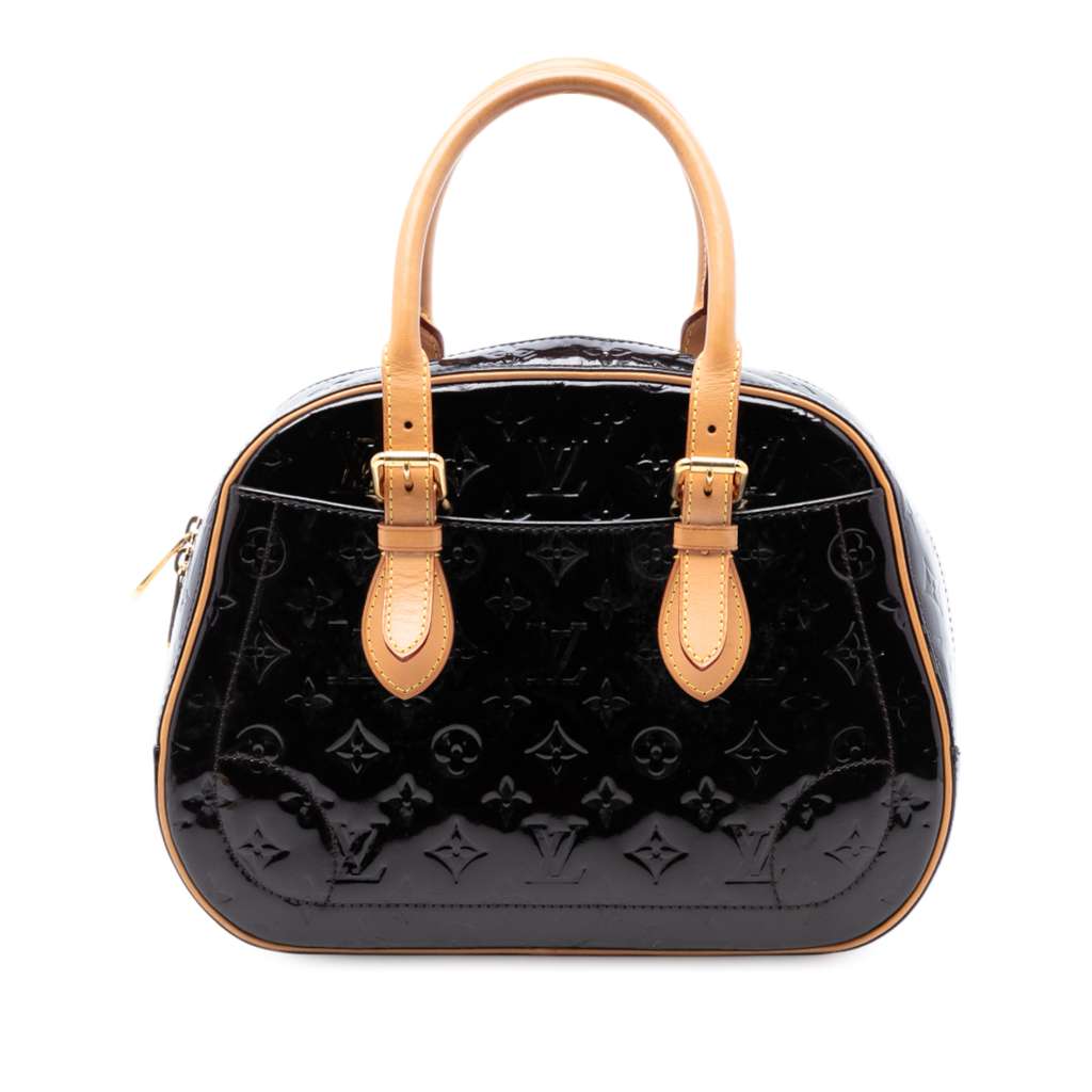 The Summit Drive features a vernis leather body, rolled leather handles, a top zip closure, exterior front and back slip pockets, and interior slip pockets.