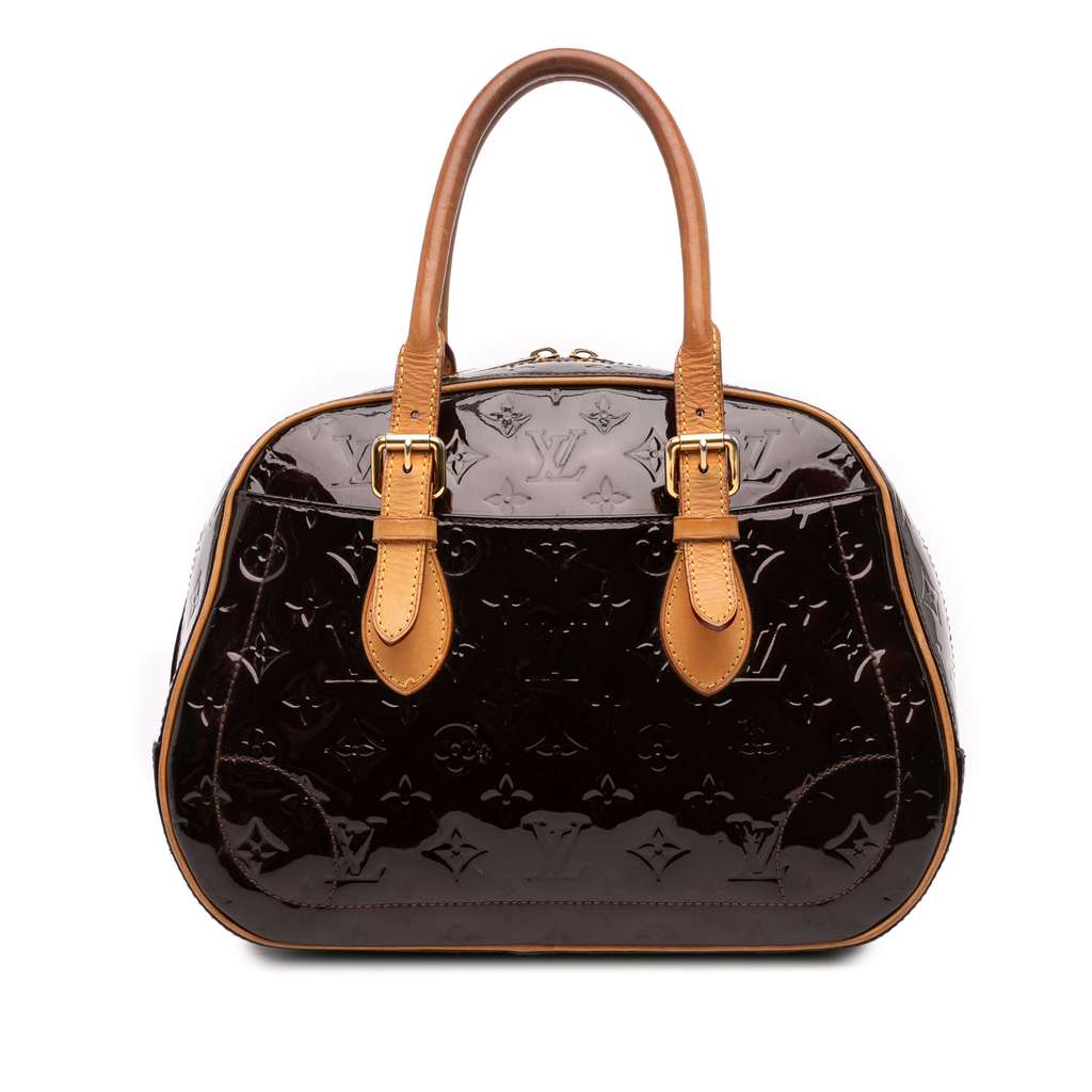 The Summit Drive features a monogram vernis leather body with vachetta leather trim, rolled vachetta leather handles, a top zip closure, exterior front and back slip pockets, and interior slip pockets.