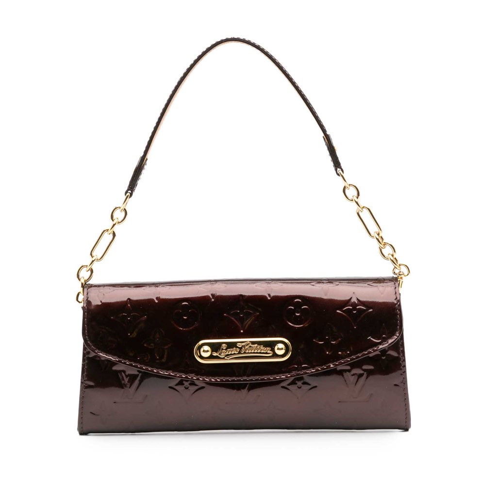 The Sunset Boulevard features a monogram vernis leather body, a curb chain strap, a front flap with magnetic closure, and interior zip and slip pockets.