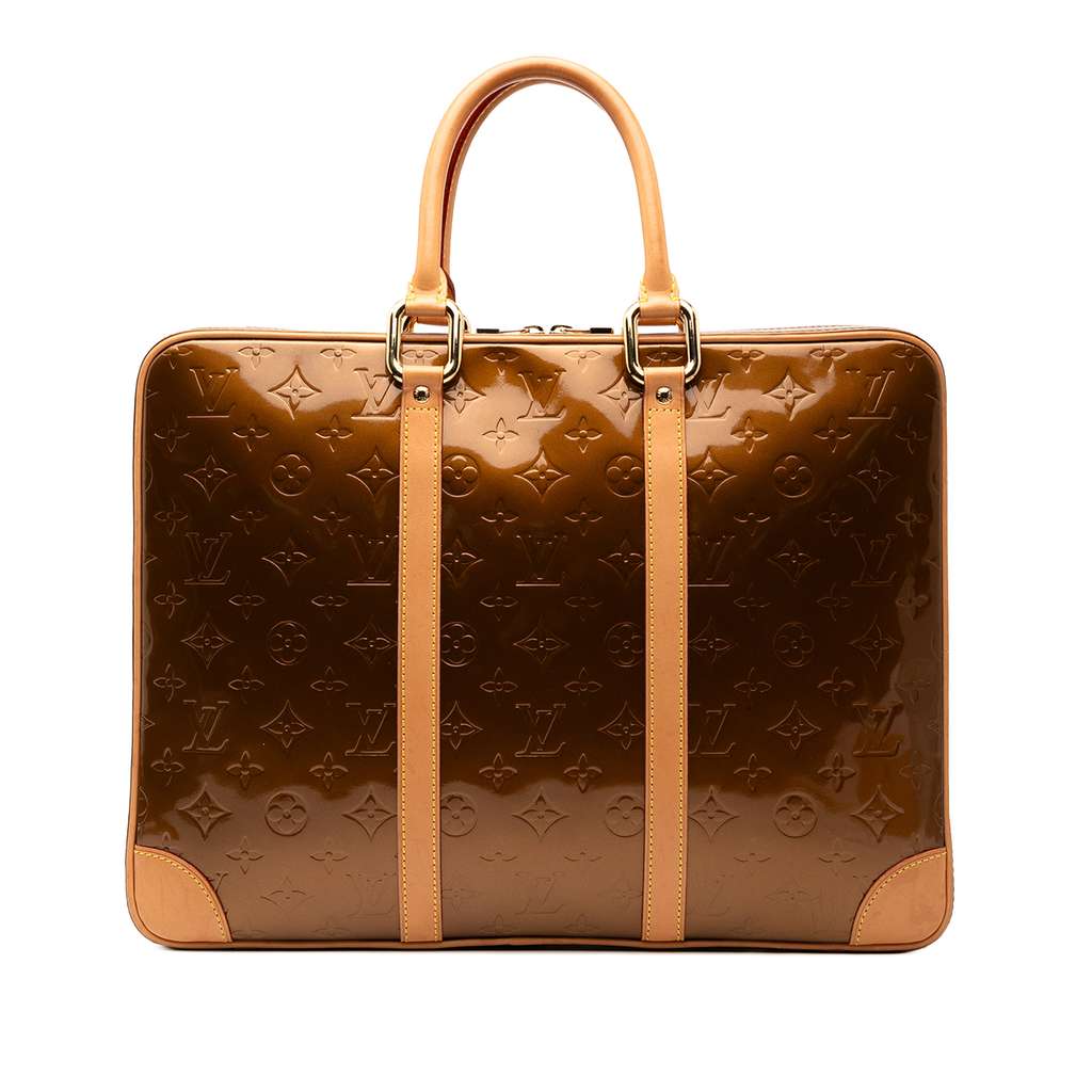 The Van Damme briefcase features a vernis leather body with vachetta leather trim, rolled vachetta leather handles, a zip-around closure, and interior zip and slip pockets.